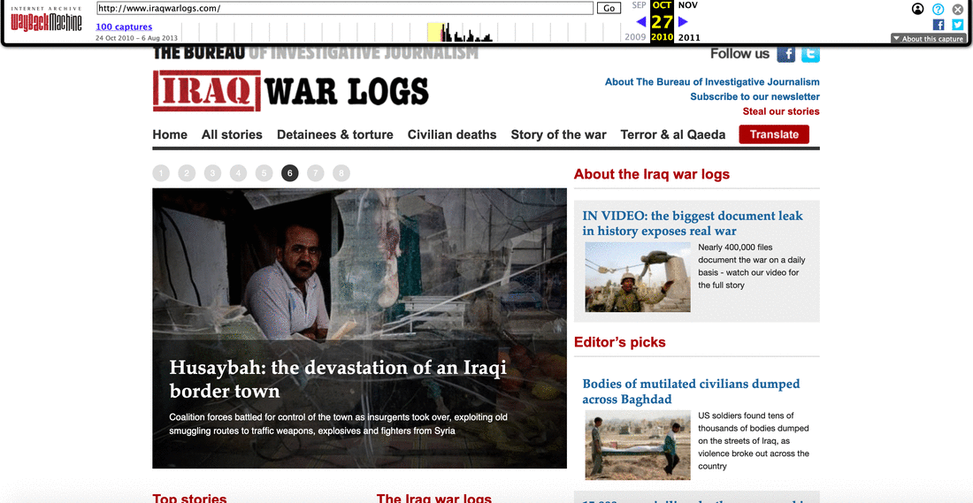Alcune immagini della copertura degli Iraq War Logs e Aghanistan War Logs (2010) nelle pagine del Bureau of Investigative Journalism, The The Guardian e New York Times
